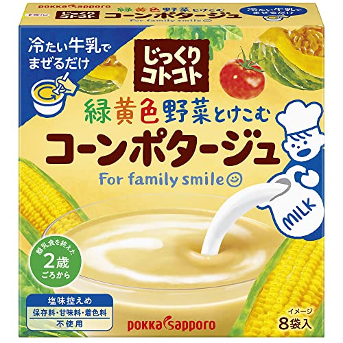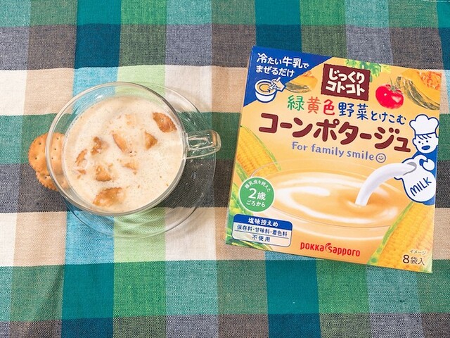 台所育児レシピの一つの例として、ポッカサッポロ「緑黄色野菜とけこむコーンポタージュ」を使った、食べるスープの作り方をご紹介します。
