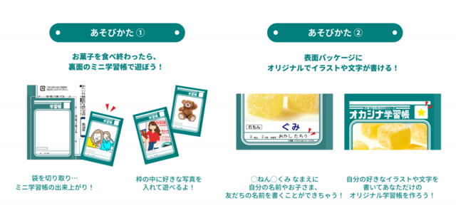 表面パッケージに名前を書いてノート風にしたり、裏面のミニ学習帳を切り取って遊ぶことが出来るとのこと。