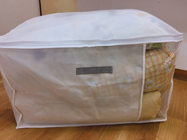 幅75cm×奥行55cm×高さ45cmで、シングル羽毛掛布団が3枚、ダブル羽毛掛布団が2枚入りました。