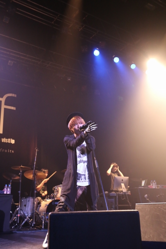 『魔女と林檎』のエンディングを怜の歌声とシャウトで飾り、スピーディーな電子音がそこへ続きライブの昂揚感をさらに上げてゆく。『ガリロン』、そして『モノドラマ』と続いたこの日の彼らのステージは、中村泰造(Ba)、ササブチヒロシ(Dr)、辺見直義(Manipulator)からなるサポート・メンバーとの5人編成。vistlipのファンの中にもおそらくいたであろう、普段はバンド・セットのみのステージを見慣れている人達の目には、ボーカル・ギター・ベース・ドラムにデスクトップPC等が加わるバロックの編成は新鮮に映ったかもしれない。そして、そのデジタル・ツールも色濃く駆使するスタイルは、バロックの独特な音楽観を象徴する要素としてあらためて強く印象付けられた。
