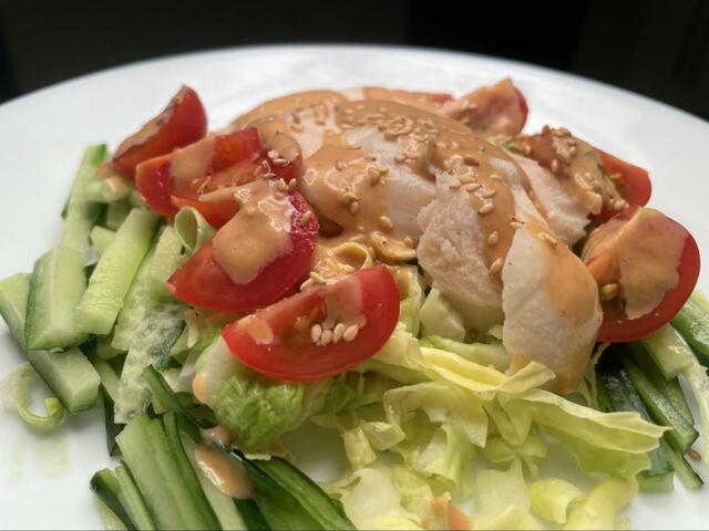 6、ごまドレッシングをかけ、煎りごまをふりかけたら完成です。
