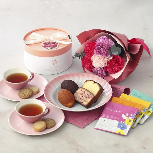 鮮やかなピンクをメインにした華やかなカーネーションブーケとアフタヌーンティー・ティールームの紅茶と焼き菓子の詰め合わせのセット。日頃の感謝の気持ちを伝えるギフトにおすすめです。