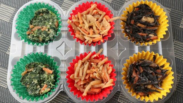 ニッスイの「3種のお惣菜」は、「ほうれん草のごまあえ」「きんぴらごぼう」「ひじきの煮つけ」が、2つずつお弁当カップに入っています。