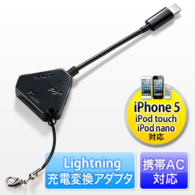 お手持ちのau、docomo、softbankなどの携帯電話用充電器・スマートフォン用充電器に接続して、iPhone5などの充電が可能になるLightning変換アダプタです。使わなくなった携帯電話充電器を再利用することができます!