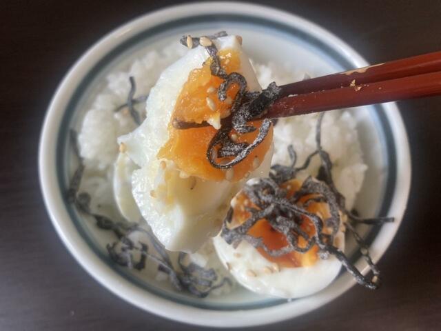 塩昆布の塩味とごま油の風味、ゆで卵の味わいがすべて完璧にマッチしています!