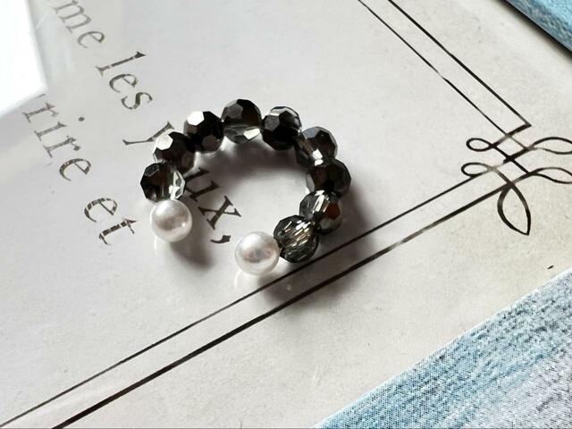 ビーズデザインのシンプルな一連の形のイヤーカフスで、先端にはそれぞれパールがデザインされ、その他の部分は透け感のある黒いビーズが使用されています。