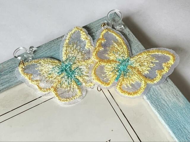 4つ目は「ノンホールピアス 蝶」です。こちらは布地のイヤリングで、蝶の刺繍が切り取られているかのようなデザインです。