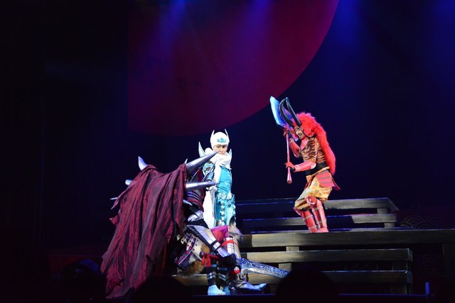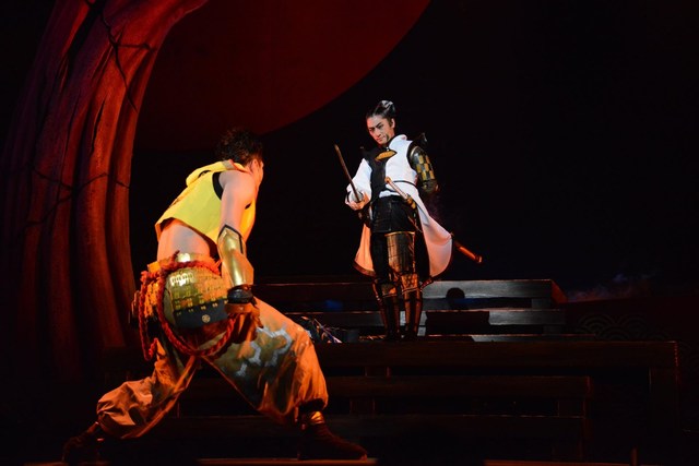 いつもよりもストーリー重視の舞台「戦国BASARA3 宴」だが、もちろん今までの作品同様、殺陣でも魅せてくれる。というよりも、殺陣と殺陣の合間にストーリーが進むといった具合で、公演時間の半分くらいは斬り合っているのではないかと思うほどのボリュームだ。本来の歴史では刃を交えることなど絶対になかっただろう武将同士の戦いや共闘が楽しめるのも戦国BASARAならではといえる。