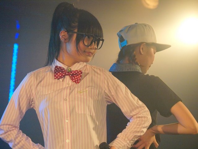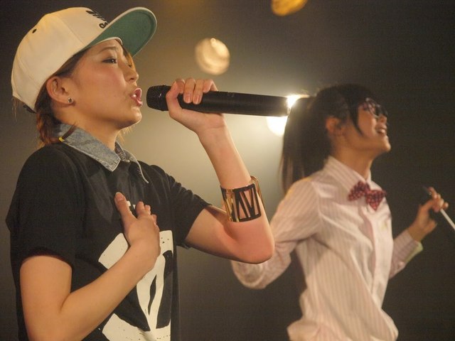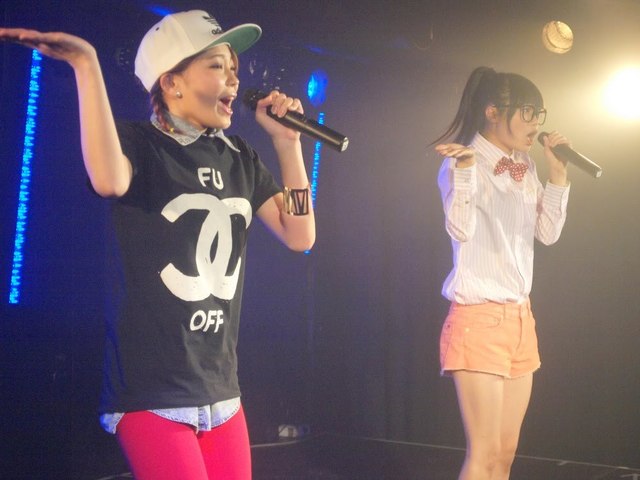 ではでは、まずFantaRhymeのライブの模様からお届けしましょう。左がAYUちゃん18歳、右がSAYAちゃん17歳なんですが、もう、てんで個性がバラバラ!BガールなAYUちゃんと、HARAJUKU萌え系なSAYAちゃん、二人ともキュートで、楽しそうにステージを駆け回ってるから見ていて楽しいです。