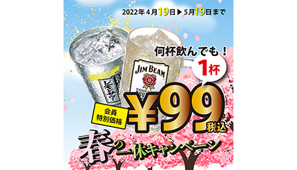 同キャンペーンでは、「こだわり酒場のレモンサワー」と「ジムビームハイボール」をオールタイム税込99円で提供する。キャンペーンの適用を受けるには、グループ全員がいずれかの一休会員であり、1名あたり別途フードを1点、ドリンクを1点注文する必要がある。