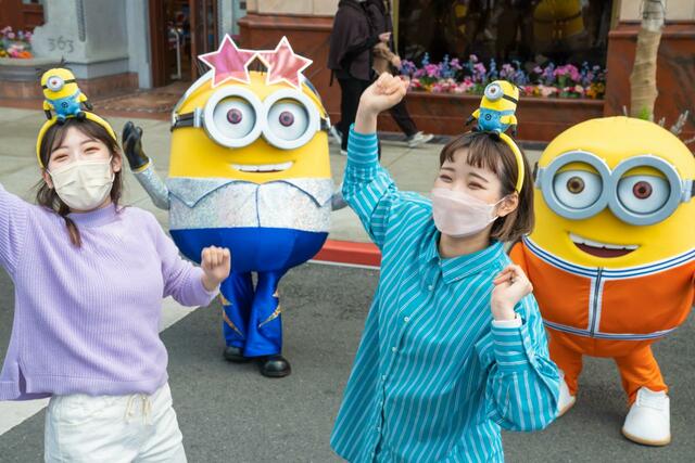 ド派手な衣装のミニオンたちが賑やかに行進しながら登場し、ゲストとグリーティングしてくれます。