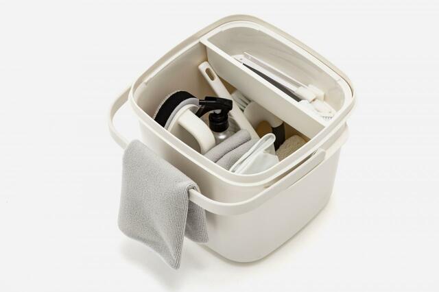 容量は9Lあり、収納力も抜群。高さ21cmのスプレーボトルからブラシやスポンジなどの細々とした掃除用具まで収まります。