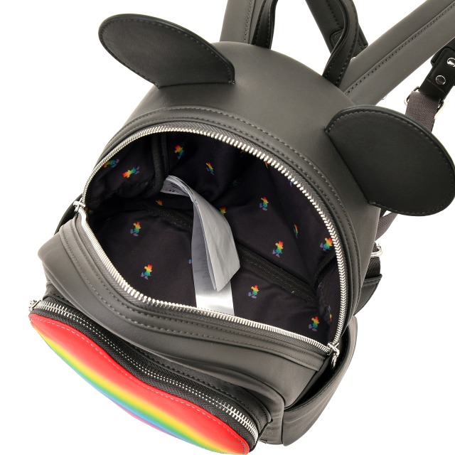 このバックパック、かわいいのは外側だけではなく、なんと内側の生地も虹色のキャラクターシルエットをあしらった総柄プリントです。
