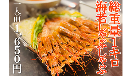 「海老しゃぶしゃぶ」は、総重量1kgの赤海老を提供する爆盛のしゃぶしゃぶで、有頭赤海老を使用することによってゃぶしゃぶを行うごとに濃厚な海老の味噌が出汁に溶け出すので、食べるごとに旨味が増していく。