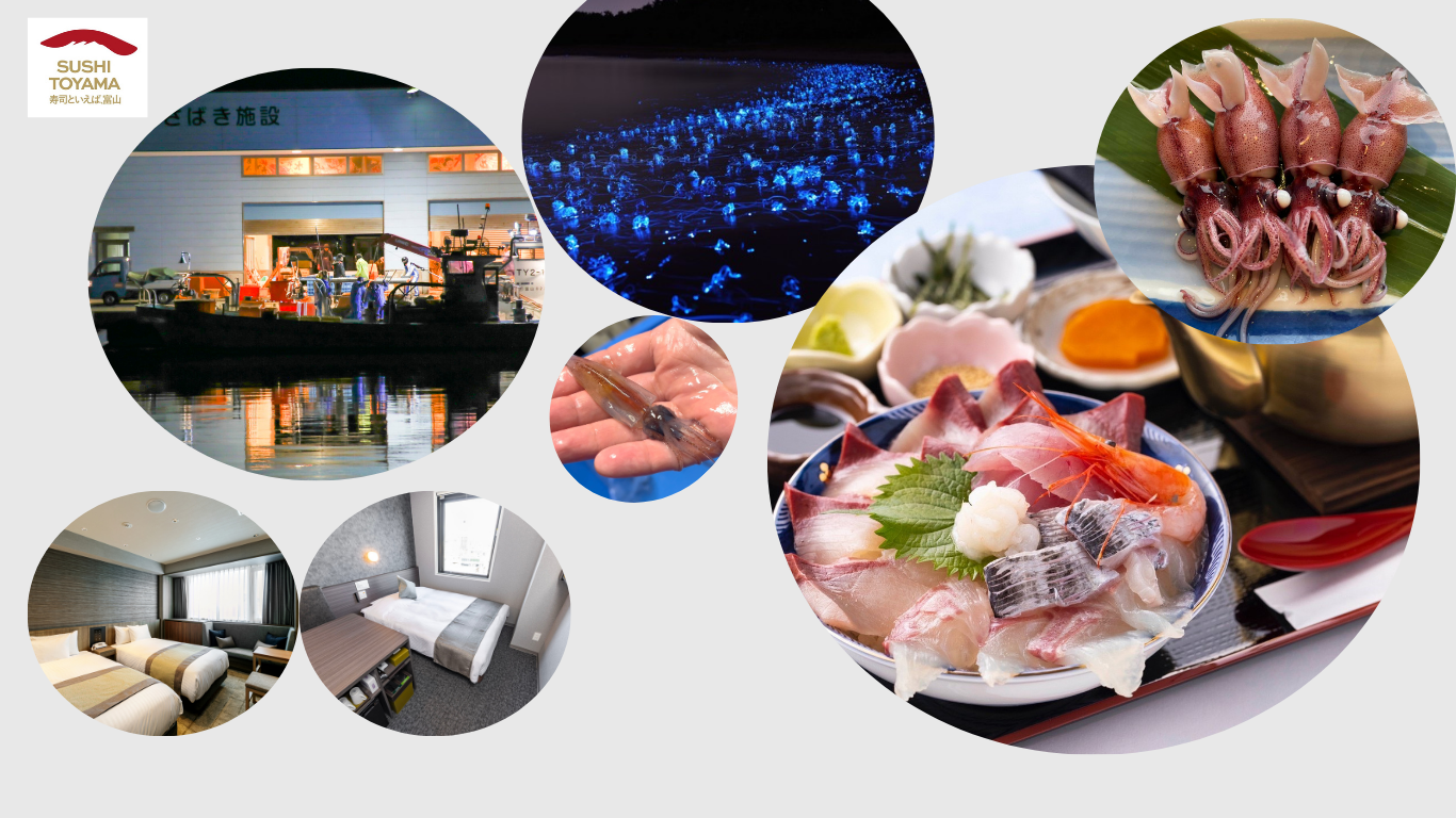 富山湾産生ほたるいか、富山湾産白えび、ねぎとろ、いくら、ぶりをお刺身で。ほたるいかは鮮度の良い状態で凍結処理しているので、生に近い状態で楽しむことができます