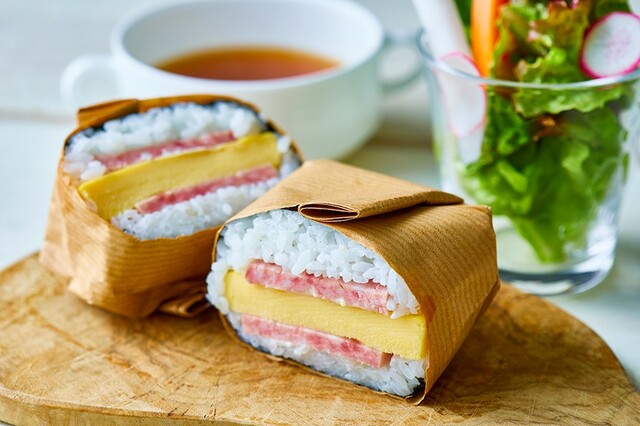 うちのたまごの厚焼き玉子と、ジューシーな雲仙ハムをサンドしたおにぎり。お子さまにも食べやすく作っています。