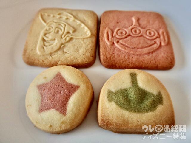 ウッディ(キャラメル味)とエイリアン(ストロベリー味)の顔柄の四角いクッキーは少し固め。