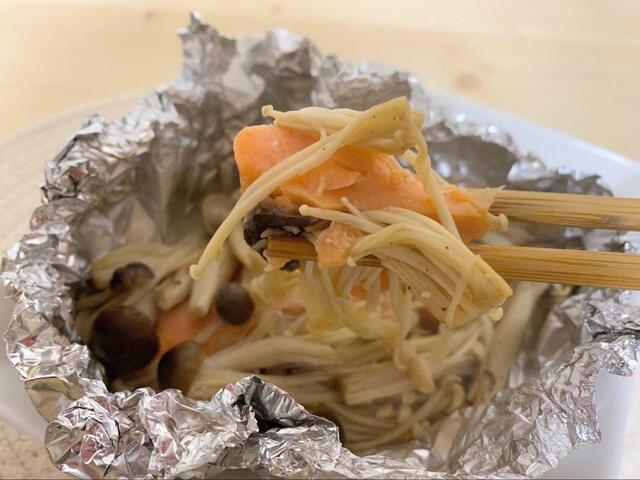 アルミホイルで包み焼きするため、きのこと鮭の旨味がたっぷり!