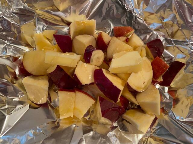 3. 加熱したさつまいもとりんごをアルミホイルにのせ、バターもいれてアルミホイルを閉じる
