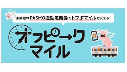 東武線の沿線共通ポイント「TOBU POINT(トブポ)」の新サービスとして、22年10月1日に東武線に登録済みのモバイルPASMOで乗車すると運賃の3%のおでかけマイルがたまる「トブポマイル」と、21年9月30日で終了した回数乗車券の代替となる「リピートマイル」の2サービスを開始。さらに、利用が集中するピーク時間帯の分散を図り、駅や電車内の混雑の平準化を目指すべく、他の鉄道会社と同等の仕組みのオフピークマイルも展開し、磁気定期券からPASMO定期券への置き換えと時差通勤をうながす。