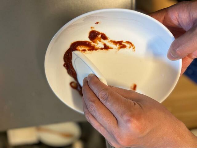 お皿についた濃い汚れを端に集めます。
