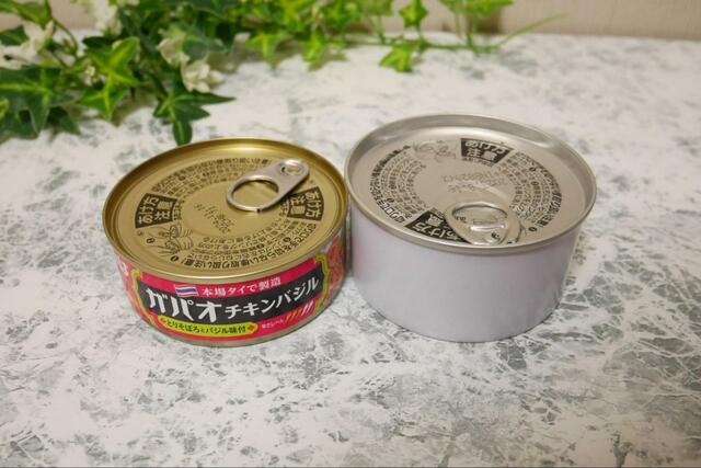 フィルムをめくると、「ガパオチキンバジル」と白い缶が入っていました。