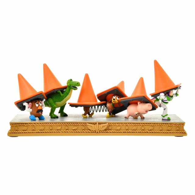 カラーコーンに入って進んでいくバズたちのコミカルながら真剣な姿を精巧に表現しています。