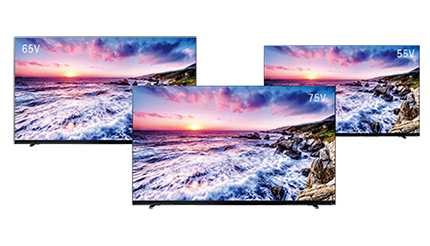 本体には、無駄をそぎ落としたミニマルデザインを採用し、左右のスタンド取付け間隔を2パターンから選べるようにすることで、テレビ台の大きさに合わせて好みの幅で設置できる。また、付属リモコンのデザインを一新し、ネット動画にダイレクトでアクセス可能なボタンを拡充するとともに、好みのネット配信サービスやHDMI入力端子を登録できる「My.Choice」ボタン×2つを備えている。