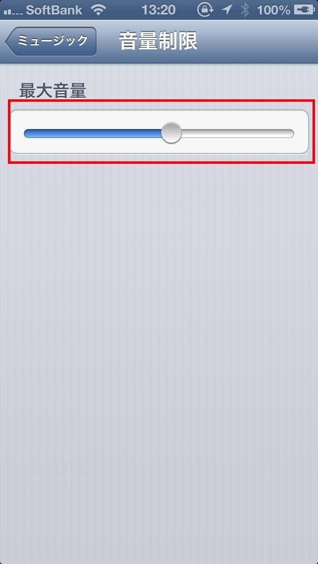 ここでは、音楽の最大音量を設定します。低めにしておくといいでしょう。これを設定することで、極端に音量の大きな曲も、他の曲と同じくらいの音量になります。