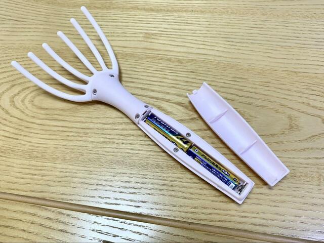 電源を入れるのに必要なアイテムは、単4の乾電池2本のみ。別途購入した電池をセットするだけで、すぐにマッサージを始められます。