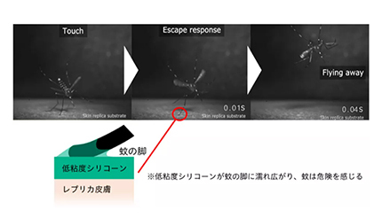 これまでに花王は、低粘度シリコーンオイルを塗布することで蚊の嫌う肌表面を作り、蚊に刺されることを防ぐ技術を報告している。化粧品に一般的に使用される低粘度シリコーンオイルを塗布した皮膚では、蚊の降着時間が短くなる。これは、低粘度シリコーンオイルが蚊の脚にすばやく濡れ広がることで蚊の脚に引力が生じ、逃避行動を誘発するためと考えられる。