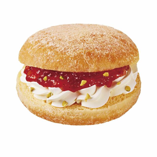 ミスタードーナツでポン・デ・リングに次ぐ人気商品という「エンゼルクリーム」に、国産フルーツフィリングをはさんだフルーツドーナツとなっています。