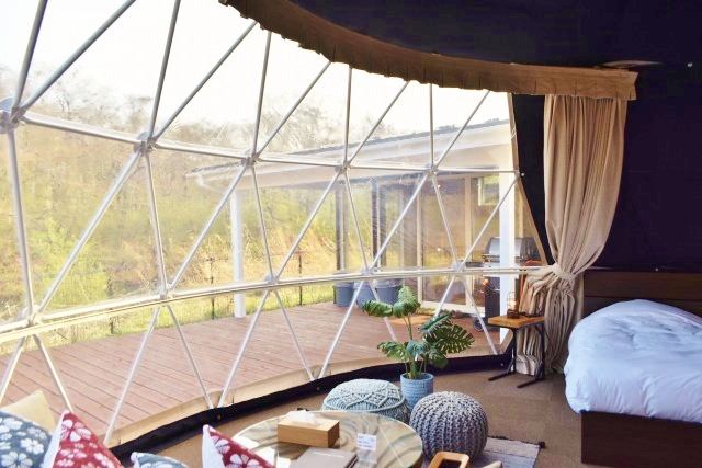 日本初登場のオリジナルテントを使用した「ラピステント」は、ゲル(移動式住居)のような室内に、シースルー素材の天蓋がかかるラグジュアリーなインテリアがポイント。天井も高くて開放的! 普通のテントでは考えられないくらい、贅沢な空間です。