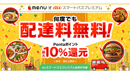 auスマートパスプレミアム会員ならmenuの配達料が無料に、利用料金の最大10%ポイント還元キャンペーンも