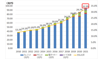 経済産業省は、キャッシュレス決済比率を2025年までに4割程度、将来的には世界最高水準の80%まで上昇させることを目指し、サービスの普及に取り組んでいる。6月1日に同省が公表した「2021年のキャッシュレス決済比率」によると、支払額ベースで32.5%だった。過去最大値で15年に比べると14.3ポイントアップした。