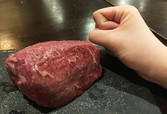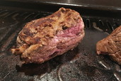 マウントロックと命名しただけに、ゲンコツサイズ。リブロースと違い、この肉は塩コショウしてあった。すべての面を焼いたら半分に切り、まだ赤い部分をさらに焼き、食べやすいサイズにカットする。