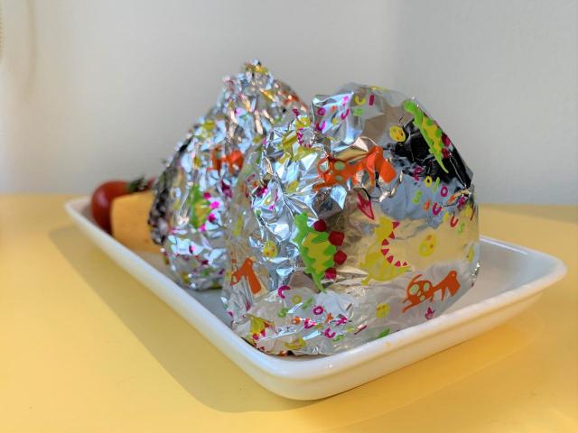「アルミホイル カラフルザウルス」おにぎりに巻いてみました