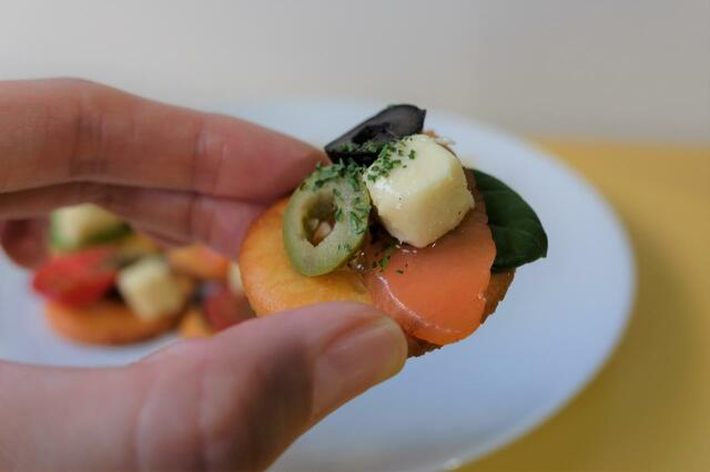ホームページによると、「キューブタイプのオリーブオイル漬け」は、カナッペやピンチョスなどの、フィンガーフードに使うのがおすすめとのことなので、試してみました。