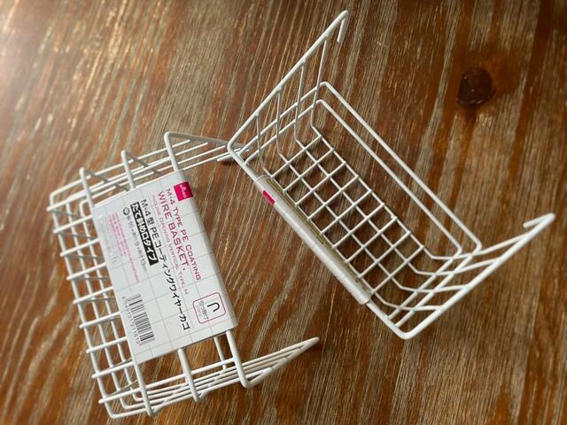 ワイヤーカゴ(たて斜め口タイプ)もネットと色味を合わせ、オフホワイトを選びました。2つ横並びで、ぴったりワイヤーネットのサイズと合います。