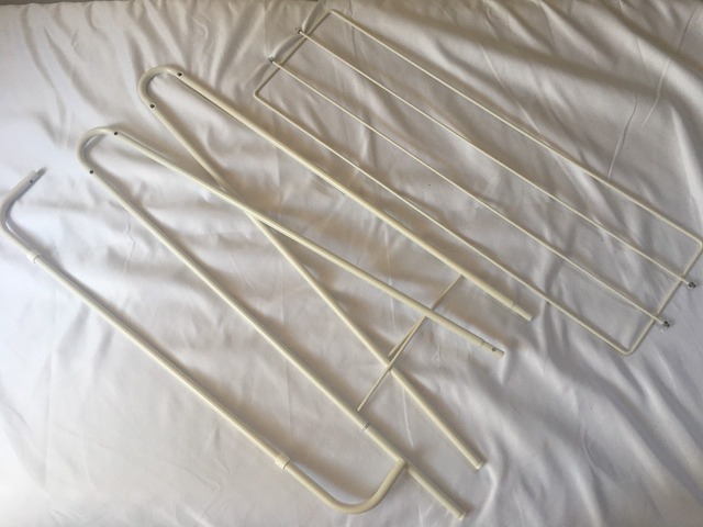 さっそく開封!箱を開けてビックリ。細い棒でできた部品がわずか4つ。これらを組み立てて果たしてタオルハンガーができてしまうのか、半信半疑でした。