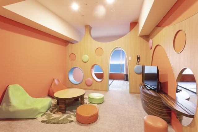 おもちゃ箱のような空間が広がる客室「ワンダーランド」は、カラフルな穴が開いた壁をくぐったり、座ったりと、楽しく遊べてワクワク感たっぷりのお部屋。