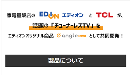 Makuakeのプロジェクトサイトによると、エディオンとTCLが共同開発したチューナーレステレビで、エディオンオリジナルの「e angle Select」として販売する。