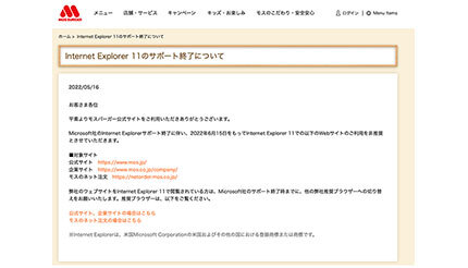 IEサポート11終了に関する案内(モスバーガー公式サイト)
