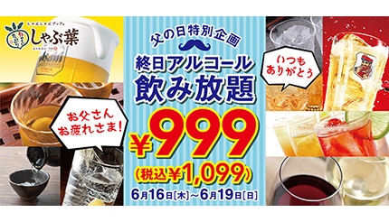 すかいらーくレストランツは6月16~19日の期間、「しゃぶ葉」で「終日アルコール飲み放題999円(税込1,099円)キャンペーン」を実施する。飲み放題の利用時間はランチ80分、ディナー100分。また、60分食べ放題コースの飲み放題の利用時間は60分となる。