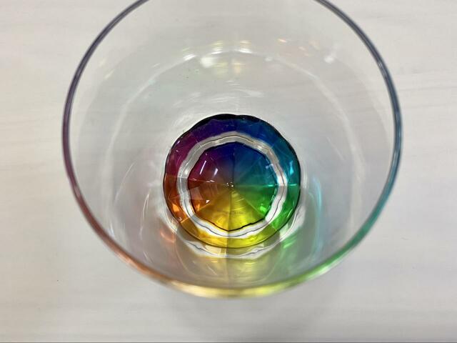 正面から見ると一般的な透明のグラスに思えますが、斜め上から覗くと、と美しい虹色の反射光が目に入ります。