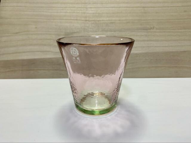 淡いグラデーションが特徴的な桃花のグラス。底の部分は緑色になっており、日本らしい和の雰囲気が感じられます。