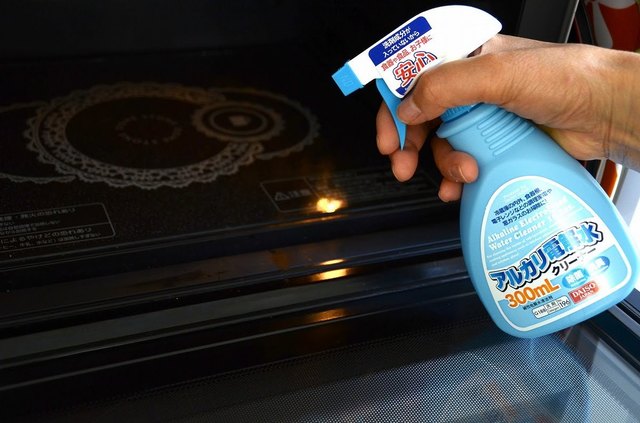 電子レンジの中の掃除は無臭で洗浄力が強く、界面活性剤が含まれていないアルカリ電解水クリーナーがベスト。中身はアルカリ性の「水」なので体にも安心。何度も洗い流す必要もありません。