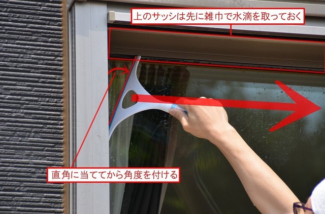 シャワーが使えない場合はペットボトルスプレーを使うと便利。スプレーに石鹸水を入れて窓に吹きかけ、濡れ雑巾で拭き取ります。仕上げに石鹸が残らないように水のスプレーを吹きかけてスクイージーをかけていきましょう。
