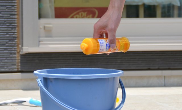 まずは、窓掃除用の洗剤を作りましょう。専用の洗剤なんて要りません。台所にある食器洗い用洗剤で十分! これをバケツに2~3滴垂らします。ほんとに2~3滴でOK。あまり濃くし過ぎるとすすぎ工程が大変になるのでご注意を。その後水をバケツの7分目くらいまで注ぎます。