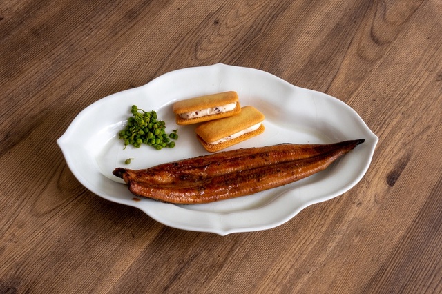 静岡県産の鰻の蒲焼きと和歌山県産の実山椒を練り込んだバタークリームを、ザクザクのサブレでサンド。